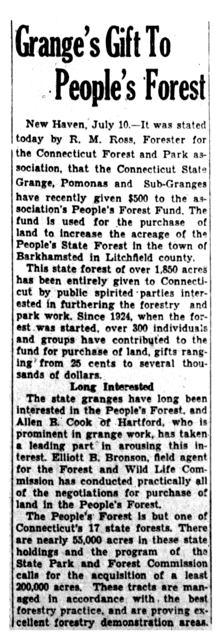 "At the 45th Annual Session of the Connecticut State Grange held in January 1930, the following resolution was accepted and adopted: “Brother Albert W. Lillibridge, Chairman of the Legislative Committee, offered a favorable report on a resolution pertaining to the Peoples Forest. Report accepted and the resolution adopted and placed in the hands of the Executive Committee for action.