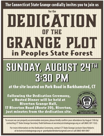 The Connecticut State Grange warmly invites members, friends, and community supporters to a special, long-anticipated event—the dedication of The Grange Plot plaque in Peoples State Forest. Join us on Sunday, August 24, at 3:30 PM at the site located in the 300 block of Park Road in Barkhamsted. The site is approximately 700 feet east of the intersection of Park Road and Slade Road.