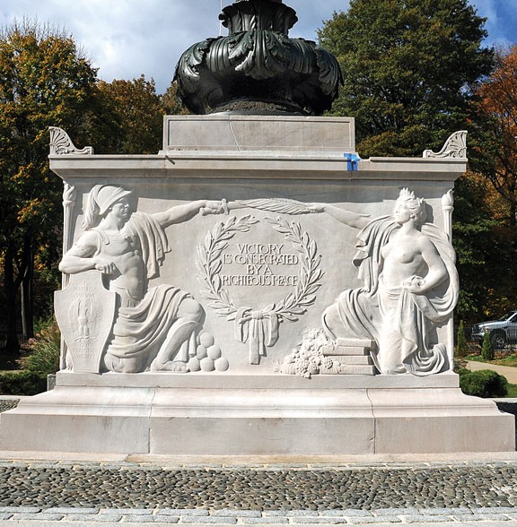 When the project was fully funded, the Hamden-based ConservArt took on the restoration process. They replaced all of the stones along the base, repaired the monument, cleaned the stains, and stripped and waxed the floral piece on the top.