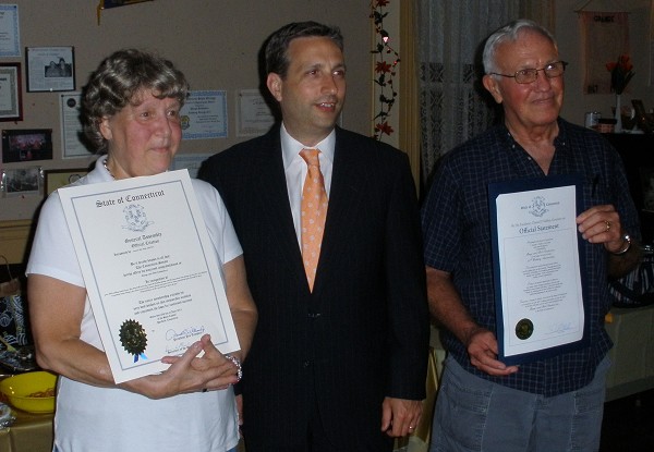A brief business meeting was held and just after Phil Prelli spoke under suggestions, the lights went out in the hall and the emergency light came on and remained that way until the end of the meeting. After the meeting was closed, some members brought in flashlights, and candles were set up for light. A reception was held in the main hall despite the power outage. Before the reception broke up, a surprise guest arrived, CT State Senator Robert Duff arrived with two proclamations. The first was a proclamation from the CT State Senate celebrating Bob and Marge’s 50th Anniversary. The second proclamation was from the office of Governor Dan Malloy for the same purpose.
