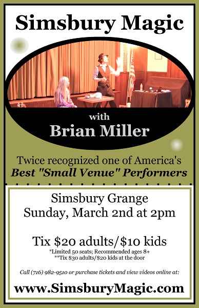 Simsbury Grange is hosting the Brian Miller Magic Show on Sunday, March 2nd at 2:00 PM at the Grange Hall.  The show should last approximately 60-75 minutes in length.  Following the show, a 30 minute group magic lesson with Brian will be offered to children. Simsbury Grange Hall is located at 236 Farms Village Road (Rt. 309), West Simsbury.
