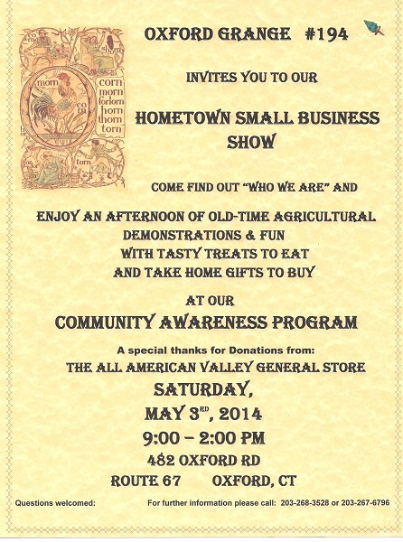 | APRIL 25, 2014 -- The Oxford Grange #194, Inc. will be hosting a Small Business Fair on Saturday, May 3, 2014 to increase public awareness of the variety of small businesses in our area. The fair will be held at the Oxford Grange Hall located at 468 Oxford Rd/CT Rte 67 in Oxford, CT. The event is open to the general public and runs from 9 AM to 2 PM. A variety of vendors has signed up for the fair and will be on hand to exhibit their goods and services. This is an excellent opportunity for the public to learn about some of the businesses and the goods and services they offer to the area.