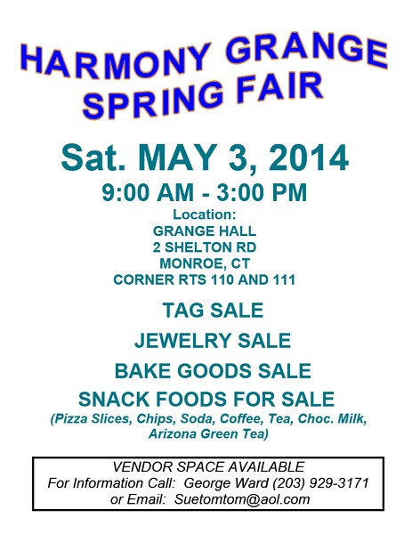 | APRIL 18, 2014 -- Harmony Grange is hosting their annual Spring Fair on Saturday, May 3, 2014 from 9 AM - 3 PM. The event will be held at the Grange Hall, 2 Shelton Road, Monroe, CT (corner of routes 110 & 111).