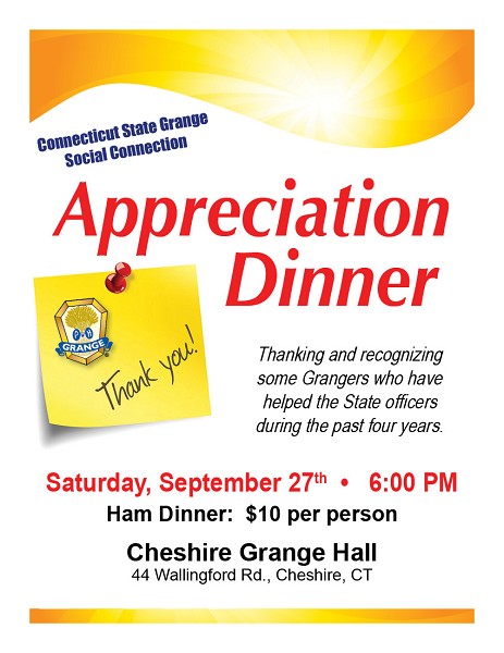 | SEPTEMBER 27, 2014 -- The Social Connection Committee of the Connecticut State Grange is hosting an Appreciation Dinner TONIGHT - Saturday, September 27th - at 6:00 PM, at Cheshire Grange Hall, 44 Wallingford Road, Cheshire.