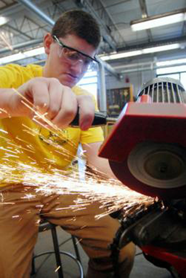FEBRUARY 2008 -- KILLINGLY - Inside Killingly High School’s agriculture mechanical shop, sophomore and future farm owner J. Allen Cameron was busy fitting silver chainsaw teeth onto a naked cutting handle.