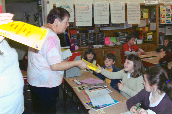Local third graders received an unexpected surprise as members of the Senexet Grange in Woodstock and Wolf Den Grange in Pomfret stopped by their schools Tuesday, Oct. 28 to give each student their very own dictionary. The visits were part of a nationwide program started five years ago that gives dictionaries to third graders every year. The dictionaries are to be kept at school during the year; unless otherwise specified by the teacher. at the end of the year, the students get to take the dictionary home. “These are for them to keep; they’re not just donated to the school,” said Senexet Grange member Tom Perry, who was on hand at Putnam Elementary School to help deliver the dictionaries to the four third-grade classes there with his wife Debby and mom Joan. A total of 97 dictionaries were given out at the school. All together, more than 250 dictionaries were given out to third-graders this year at Putnam Elementary School and St. Mary School in Putnam, Woodstock Elementary School and Pomfret Community School. Each dictionary comes complete with a special place for every third grader to write his or her name, which was the first thing Joan Perry pointed out to the children when visiting the classrooms. She also pointed out the U.S.A. map of states and capitals, the Roman numerals chart, cursive writing helper and the five big words sections at the back of each dictionary. “We always point that out,” said Tom Perry of the five big words, noting that Mary Poppin’s word “supercalifragilisticexpialidocious” - the word to say when there is nothing to say- is included in the dictionary. According to Tom Perry, the dictionary may be small, but the knowledge contained within is priceless. “It’s a very simple dictionary, but it’s got everything” they need, he said. The Senexet Grange got involved in the Dictionary Project during its inception, though not all of the schools they now give dictionaries were recipients at first. “[This is the] second year for the dictionary project,” said Tom Perry. This is also the first year the Wolf Den Grange in Pomfret has climbed on board with the project. Members from the Senexet Grange have handed out dictionaries to Pomfret Community School in the past. Wolf Den Grange member Sybil Williams visited Pomfret Community School with Tom Perry and Joan Perry. According to Joan, it was through her encouragement that the Wolf Den Grange got involved. “We have given to Pomfret in the past,” Joan Perry said. “I encouraged them to take over.” The Wolf Den Grange gave out a total of 54 dictionaries to the three third-grade classes at Pomfret Community School and, much like the students at Putnam Elementary School, the PCS students were thrilled with their gifts. Even the teachers get excited about the dictionaries. “This is the perfect age for this because they are so interested,” said Dana Heilemann, third-grade teacher at Pomfret Community School. And the children love it when the Grange members stop by. “Most of the time, it’s a surprise,” said Joan Perry. The responses always come as a surprise to the Grange members as well.